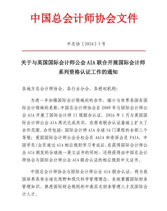 关于与英国国际会计师公会AIA联合开展国际会计师系列资格认证工作的通知